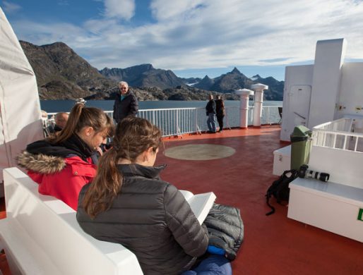 Når dagen går på hæld, går vi ombord på M/S Sarfaq Ittuk. Der er afgang kl. 21, og forude venter en dag ombord med kurs mod Ilulissat. Kystskibet sejler op og ned langs vestkysten og er populært blandt grønlænderne selv. Når skibet lægger til i kystbyerne, er der en stemning af gensynsglæde, når folk skal hente deres længe ventede venner og familie.
